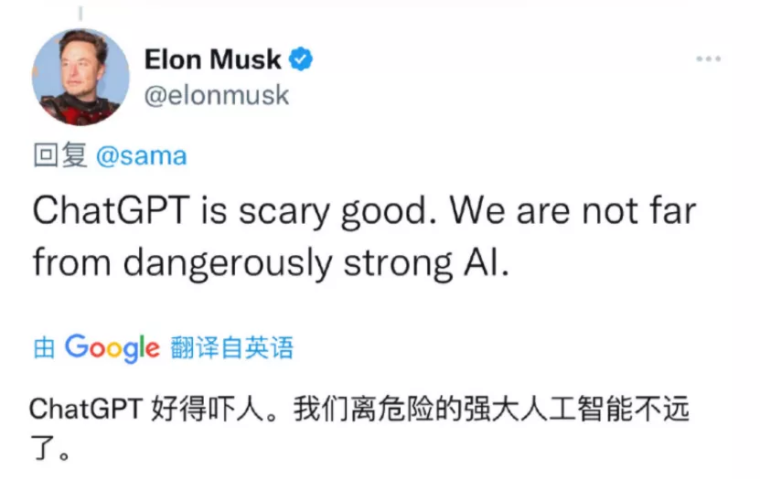 马斯克使用 ChatGPT 后感叹道,“好得吓人......我们离强大到危险的AI不远了。”