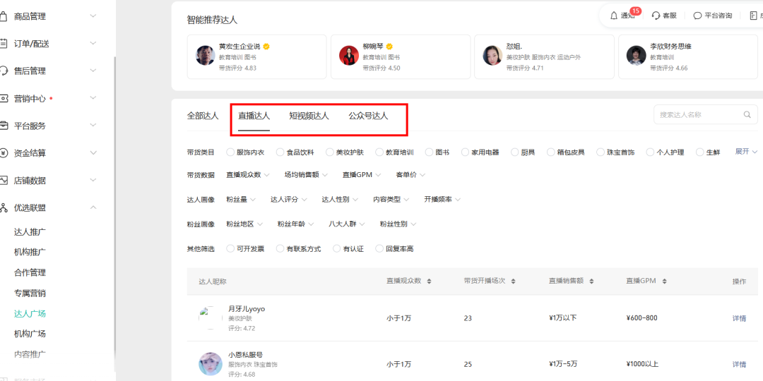 第二步,点击达人广场,查看想要合作的达人,达人类型又分为直播达人、短视频达人、公众号达人,商家可以在这里筛选更精准、更优质的达人。