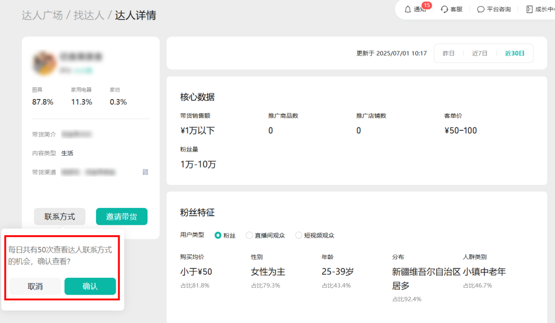 在筛选达人时,优先选择与店铺类目一致的达人(服饰商家找服装类主播),达人的粉丝群体与产品受众重合度越高,转化率越高。