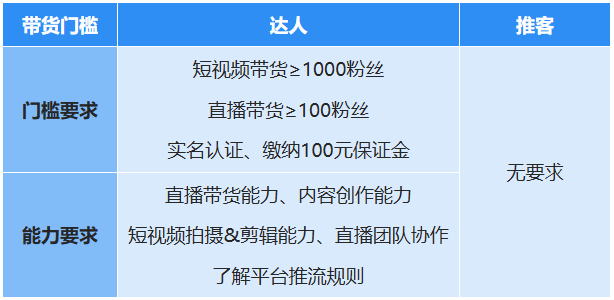 第二个差异在于带货门槛,达人需要有直播带货能力、团队支持(中控、助播、投手)、短视频拍摄&剪辑能力、内容创作创新能力,更像是一个“自媒体创业者”。