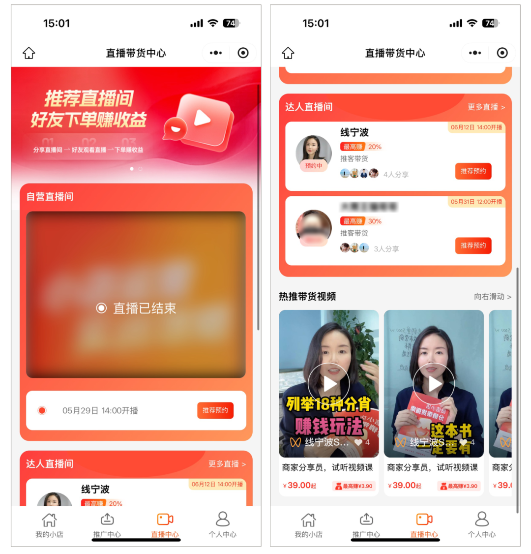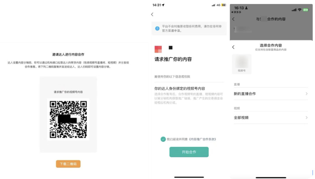 带货机构邀请达人进行内容合作,将达人的直播间、短视频授权到推客分销小程序内,直播间和短视频经过推客二次转发,有助于提升流量和销量。