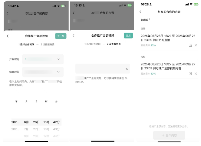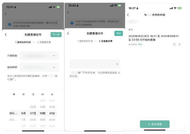 直播合作:点击「新的直播合作」-选择合作时间-设置对应的服务费(即给带货机构的佣金)-点击「完成」授权成功。