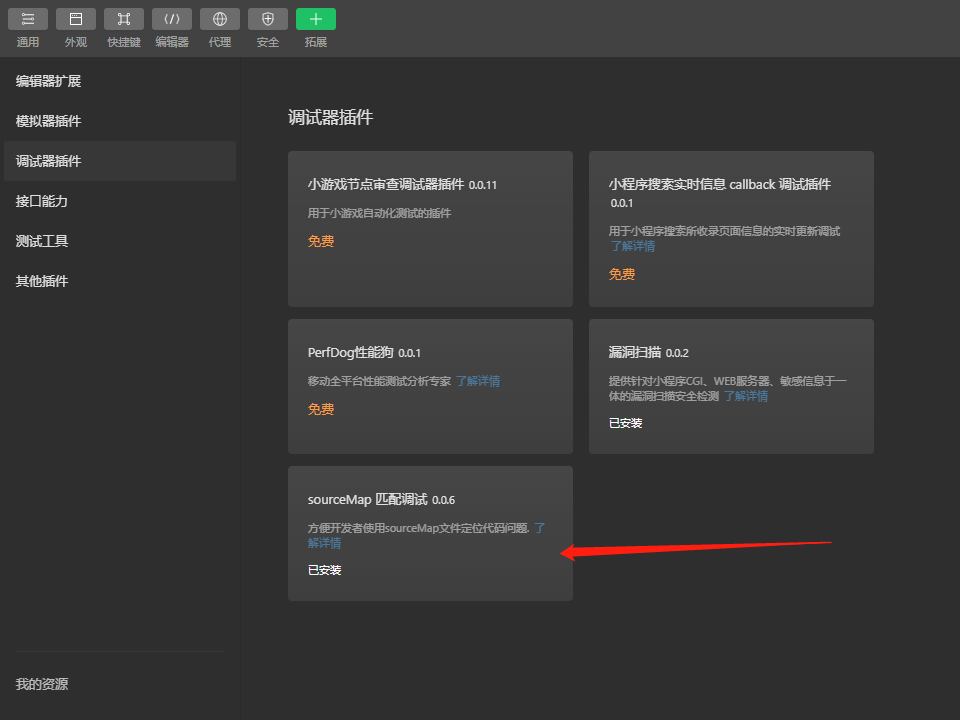 找到 扩展设置 ,选中 调试器插件 ,安装 sourceMap匹配调试
