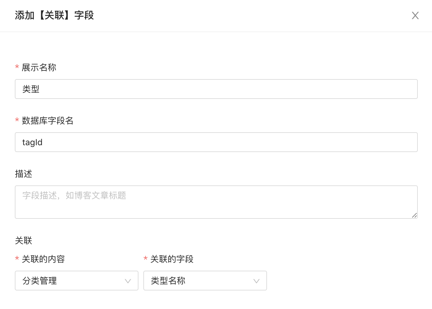 把关联字段填写上,然后选择需要「显示的字段」。CMS 会默认用模版表的「关联字段」和关联表的_id进行联合查询。