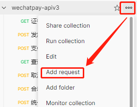 1、选择导入的脚本所在的集合,点击“...”,选择Add request