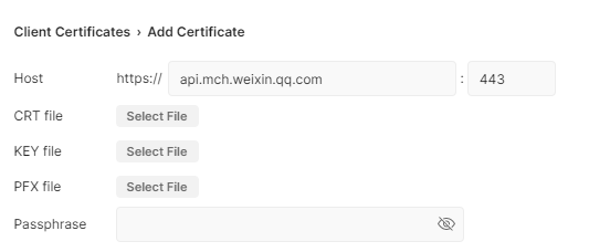 - Host:第一个文本框填api.mch.weixin.qq.com(V2接口的域名),第二个文本框填443