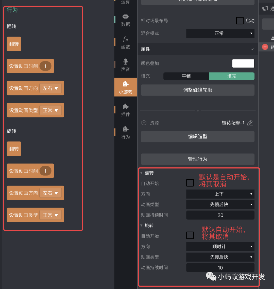 接下来我们会为樱花花瓣增加两个行为:翻转和旋转。用于模拟花瓣飘落的感觉。
