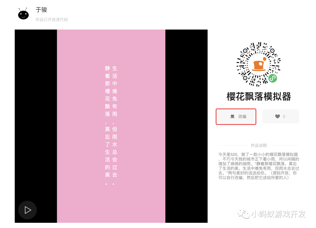 打开后,点击“改编”按钮,就可以获取到完整的项目工程,进行改编和创作啦!(如果你之前没有注册过“微信小游戏开发工具”的话,用微信扫码登陆一下即可)