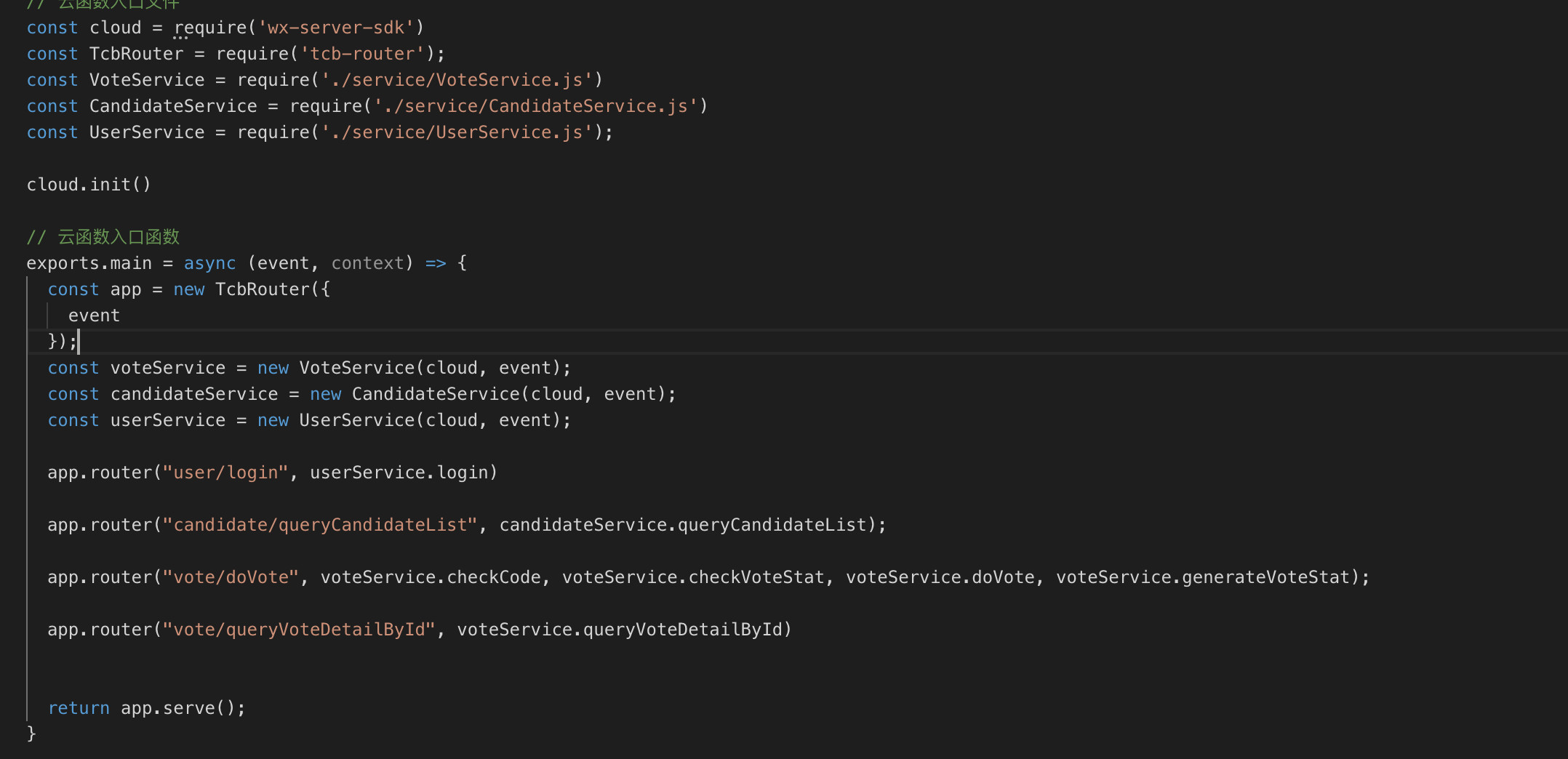 云函数入口没什么特别的,正常使用,无非是在原有基础上进行了模块化。