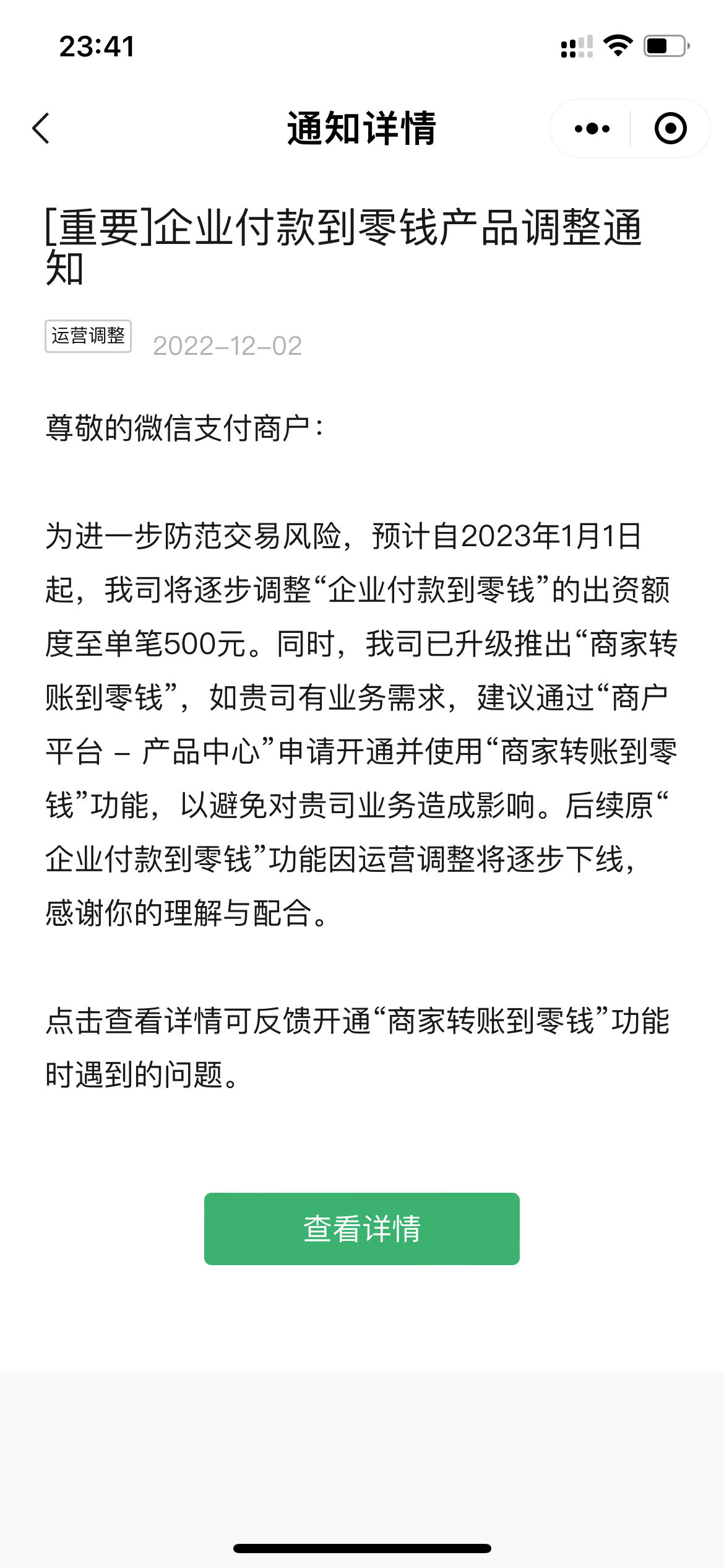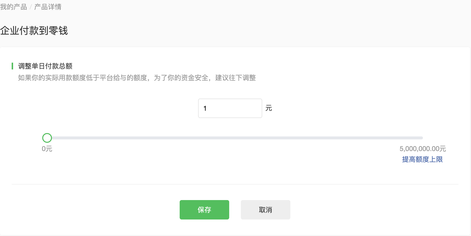 请查看自己当前额度上限后,再确认是否需要提升额度。申请额度需和业务场景额度匹配,请勿申请虚高额度(提现额度查询入口:商户平台-产品中心-企业付款到零钱-设置页面,点开调整额度,坐标轴最右即为当前最高额度)