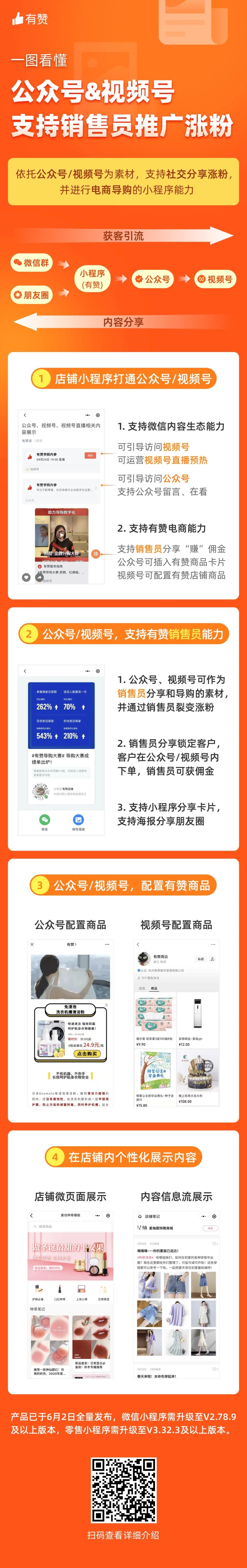 2.支持销售员推广在小程序内配置的公众号、视频号内容(包含视频号直播);