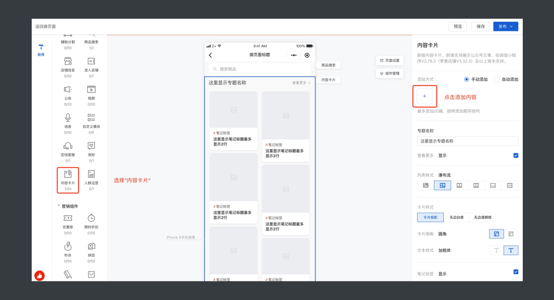 可在微页面,使用内容卡片(原店铺笔记卡片)配置多种样式展示。