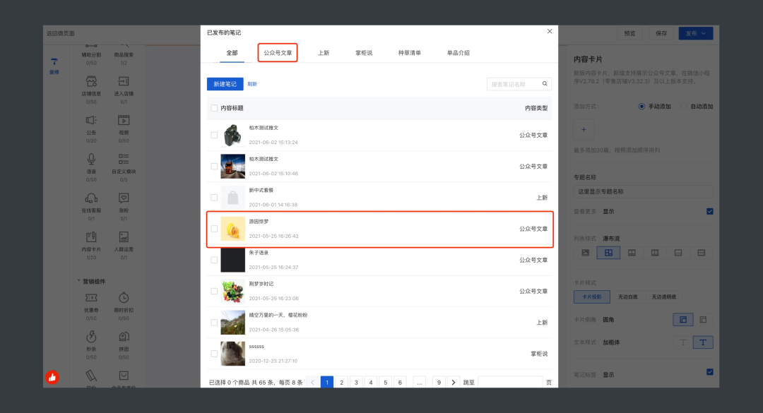 选择指定的内容,支持公众号文章与店铺笔记混合排列展示。添加完成后,可配置多种展示样式。