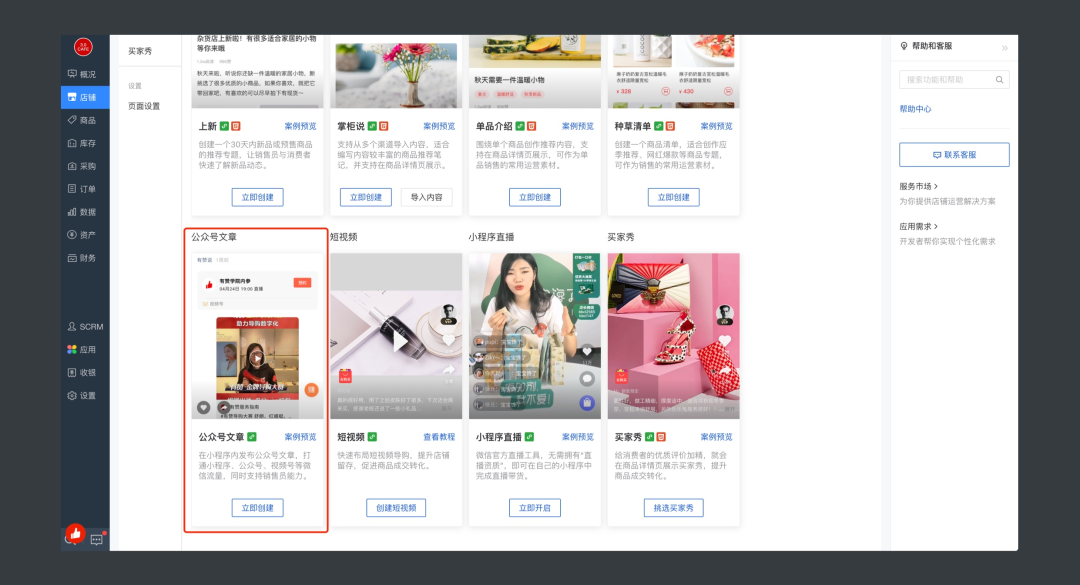 1.支持在微信小程序的店铺主页、微页面、内容页面配置公众号、视频号内容(包括视频号直播);