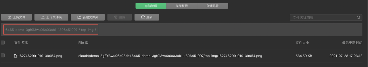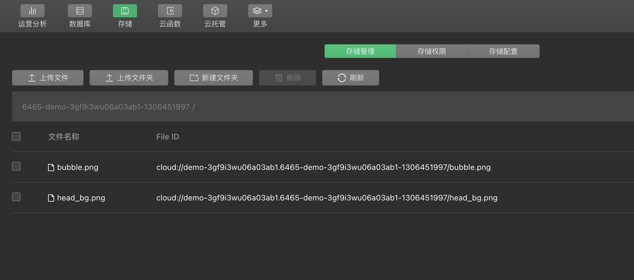 这张默认图片其实就是我们之前手动上传到云存储上面的,打开云开发控制面板选择「存储」可以看到之前上传的背景图和气泡图。