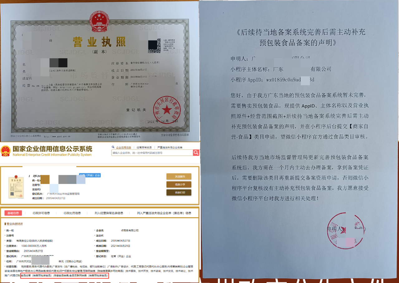您好,由于我方广东当地的预包装食品备案系统暂未完善,需要售卖预包装食品,现提供AppID、主体名称以及营业执照原件+经营范围截图+后续待当地备案系统完善后需主动补充预包装食品备案的声明,并在小程序后台提交【商家自营-食品】类目申请,望微信小程序官方通过食品类目审核。