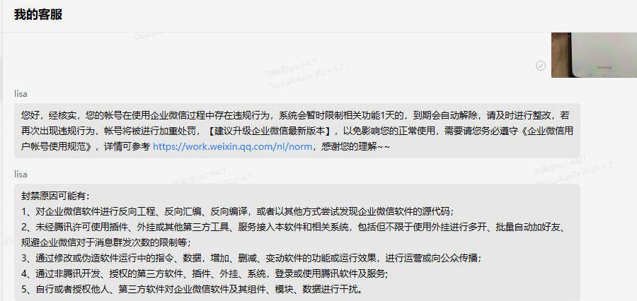 您好,经核实,您的帐号在使用企业微信过程中存在违规行为,系统会暂时限制相关功能1天的,到期会自动解除,请及时进行整改,若再次出现违规行为,帐号将被进行加重处罚,【建议升级企业微信最新版本】,以免影响您的正常使用,需要请您务必遵守《企业微信用户帐号使用规范》,详情可参考 https://work.weixin.qq.com/nl/norm,感谢您的理解~~