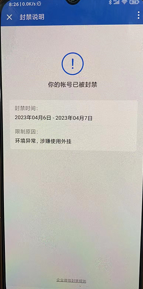 提示账号被封,“环境异常,涉嫌使用外挂”。企微账号正常使用,被封后找客服解决问题,不料客服做起复读机只会重复