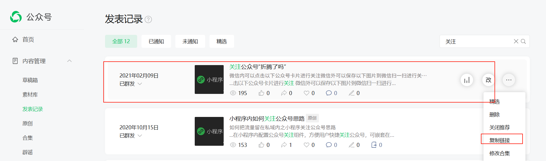 2.写一篇公众号文章,发表后,获得公众号文章的地址