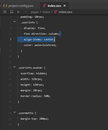 const gulp = require('gulp');const sass = require('gulp-sass');const rename = require('gulp-rename');const { src, dest, watch } = gulp;const scssFiles = ['**/*.scss', '!pages/index/index-common.scss', '!./style/flex.scss', '!node_modules/**'];const compileSCSS = function() {// 所有文件夹下得scss文件,排除components目录,排除node_modules目录return src(scssFiles).pipe(sass().on('error', sass.logError)).pipe(rename({extname: '.wxss'})).pipe(dest('./', {overwrite: true})); // 编译出来的文件放回scss文件所在目录};module.exports.default = function() {watch(scssFiles, compileSCSS)};在project.config.json里配置一下就可以直接用sass了