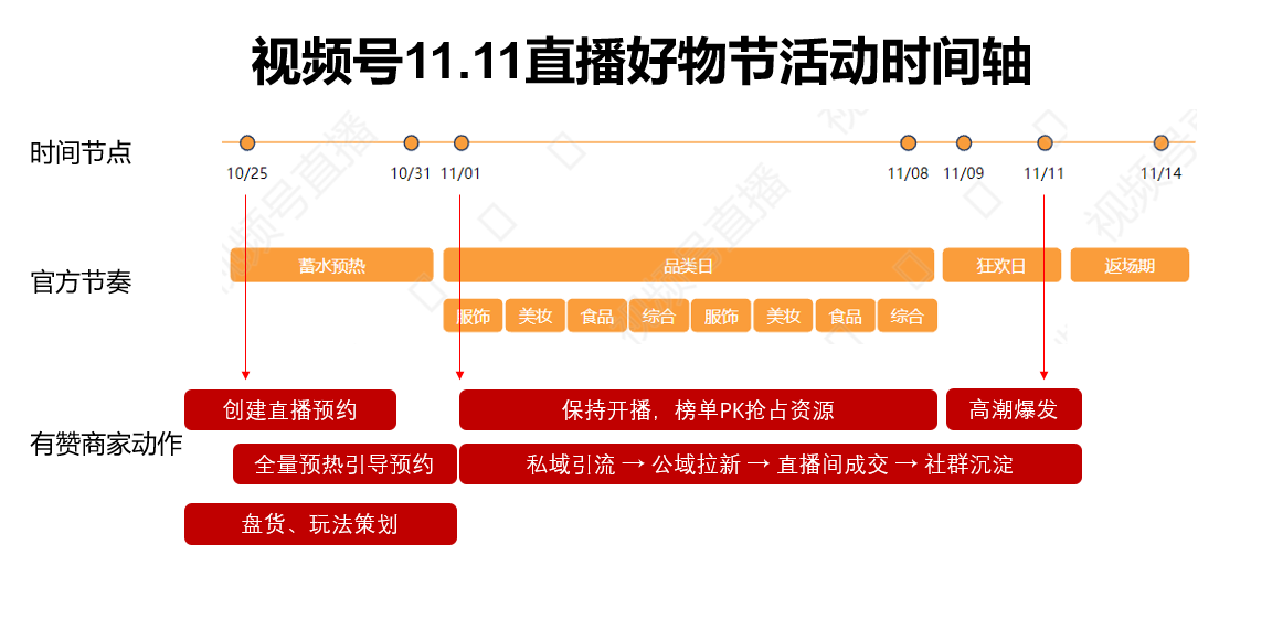 温静表示:“本次11.11活动,是视频号直播大促的练兵战,旨在跑通视频号大促链路。基于时间轴,活动主要可分为预热期、品类日、狂欢日、返场期四个阶段,每个阶段商家需落地不同的动作。