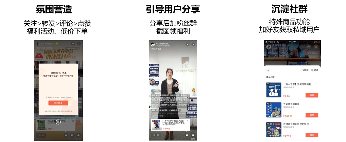 第四,在直播中持续引导分享与加群。在直播中,持续导流和确保用户停留时长尤为重要,商家可利用福利活动、低价下单,引导用户进行关注、转发、评论、点赞等动作,营造直播间氛围,吸引用户持续关注。同时,通过分享领福利的方式,引导用户分享直播间。此外,利用有赞“特殊商品”功能,商家可引导直播间用户加入社群,沉淀私域流量。