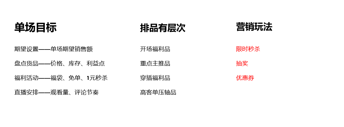 首先,在预热期做好盘货、活动策划。商家需先设定单场预期目标,然后拆解这一目标所需要的货品。直播时,基于“开场福利品、重点主推品、穿插福利品、高客单压轴品”的逻辑设置商品推荐顺序,同时匹配有赞诸如限时秒杀、抽奖、优惠券等营销玩法。