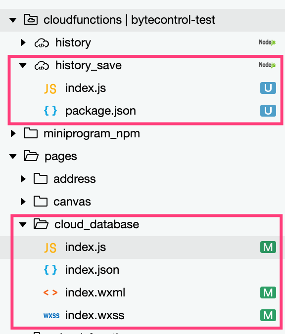 新建页面 cloud_database 用做演示,新建云函数 history_save,目录结构如下: