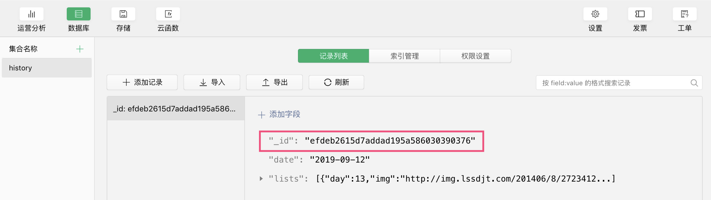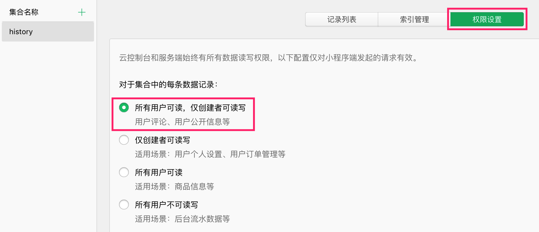 新建集合 history,设置集合权限为:所有人可读。如下图所示: