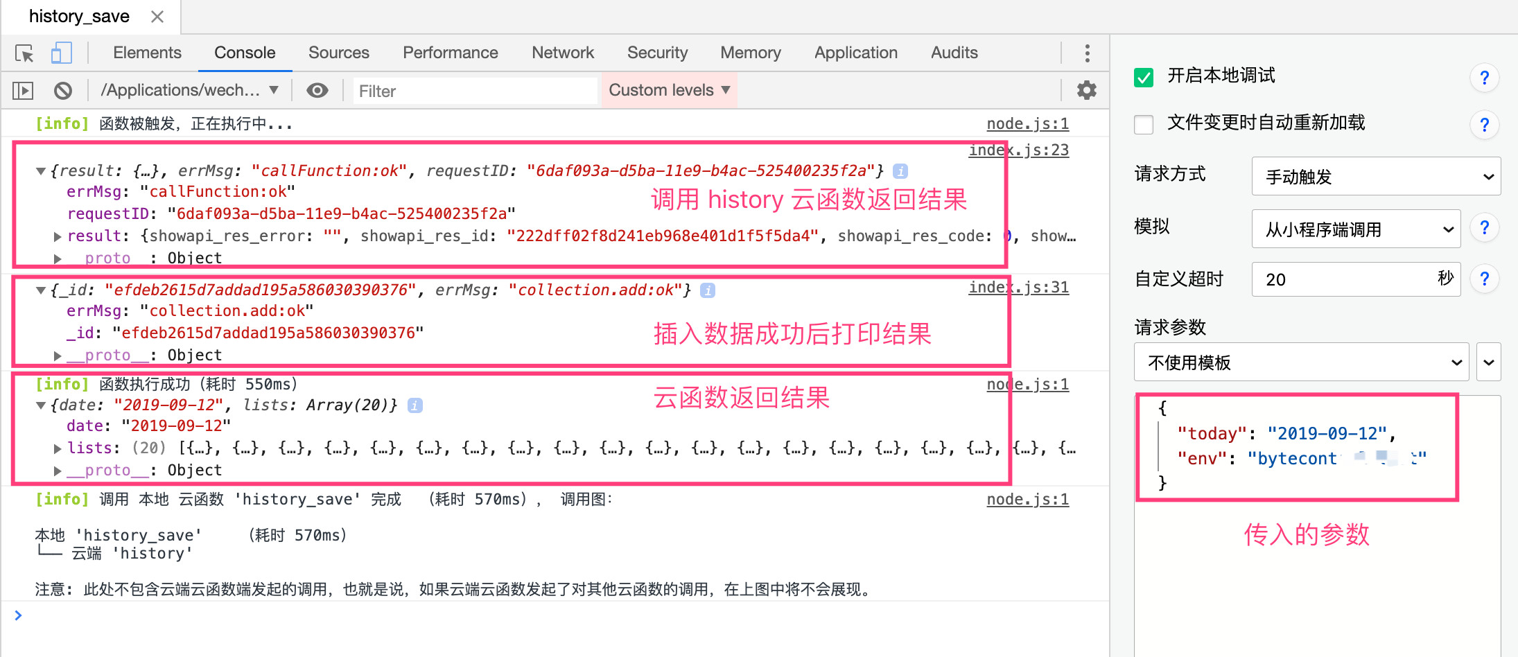 这个云函数的逻辑就是调用 history 云函数,获得数据,保存到数据库中,然后返回数据。其中有 4 处地方,需要提一下: