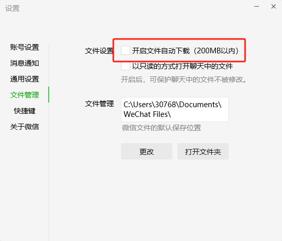 【可选】如果加入很多非常活跃的微信群(大量的文件之类的消息),可以考虑关闭文件自动下载。