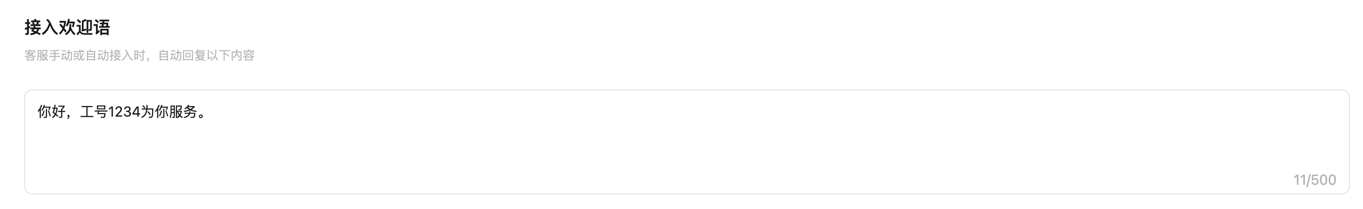 - 接入欢迎语:客服接入会话时的自动回复,支持每个客服自定义配置。每个客服配置后,欢迎语会在接入会话时自动下发给用户。