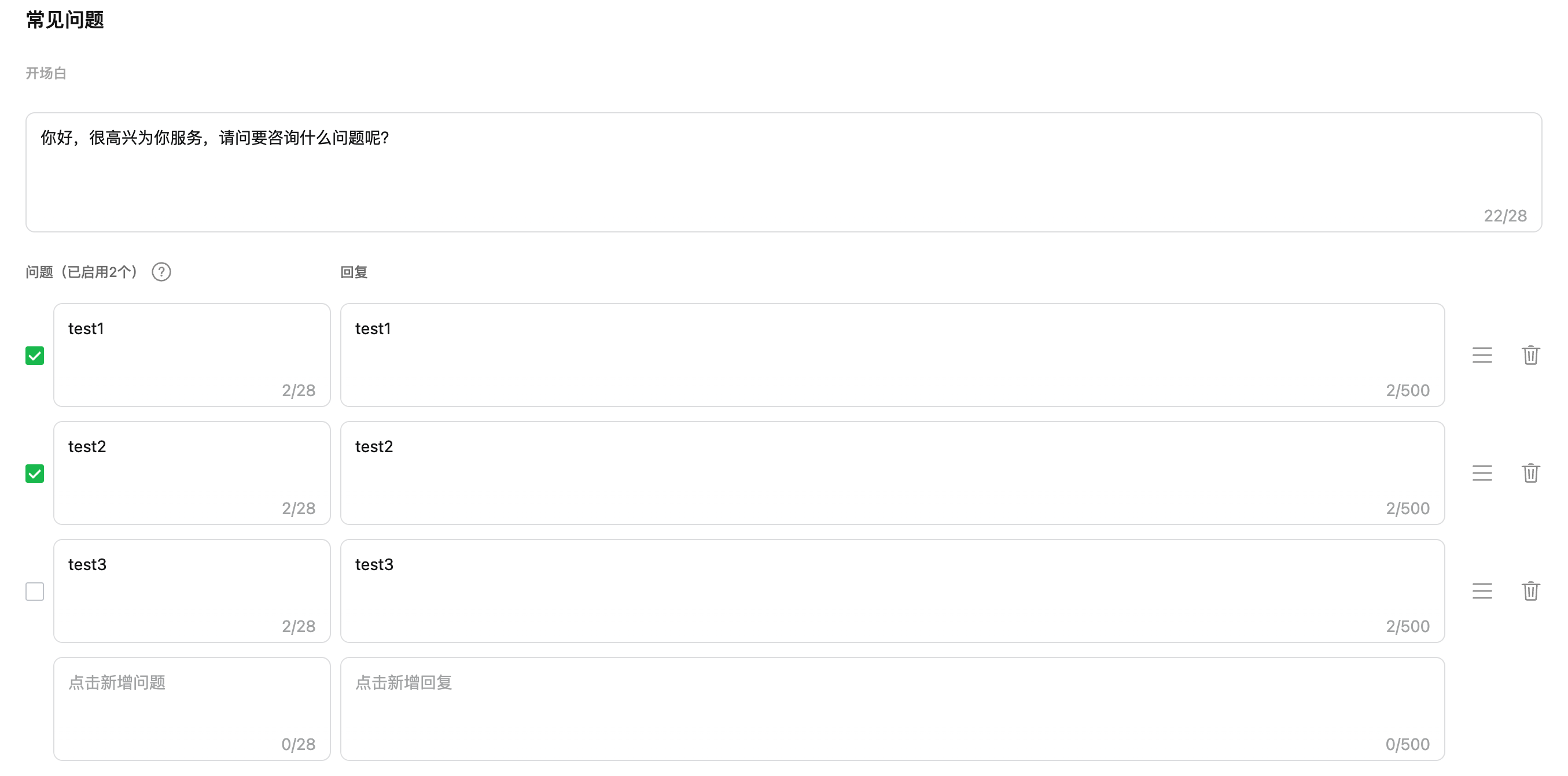 - 常见问题:包括「开场白」(必填) 和「问题知识库」,支持客服管理员配置。客服管理员设置后,用户发送消息,客服无需接入会话即可自动回复常见问题。支持配置5组知识库,支持勾选生效。