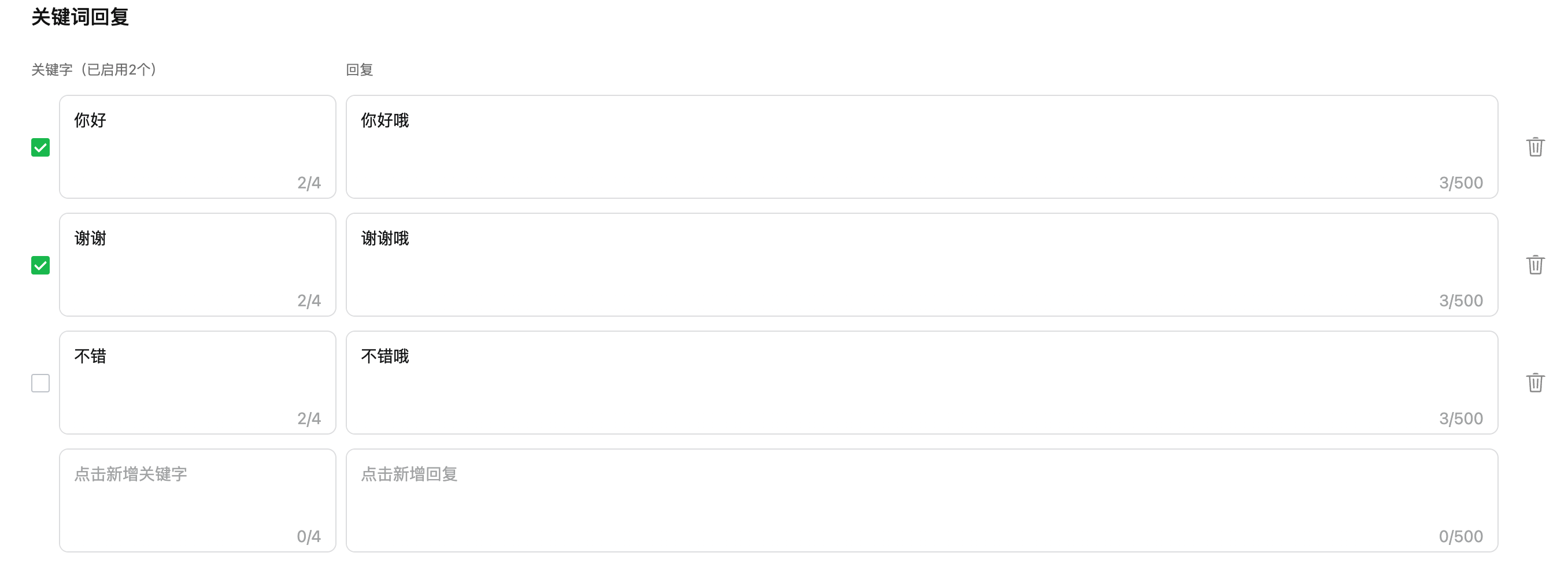 - 关键词回复:至多5组问答知识库,当用户发送的消息命中关键词,客服自动下发回复消息,支持勾选生效,客服在线离线均生效。支持客服管理员配置。