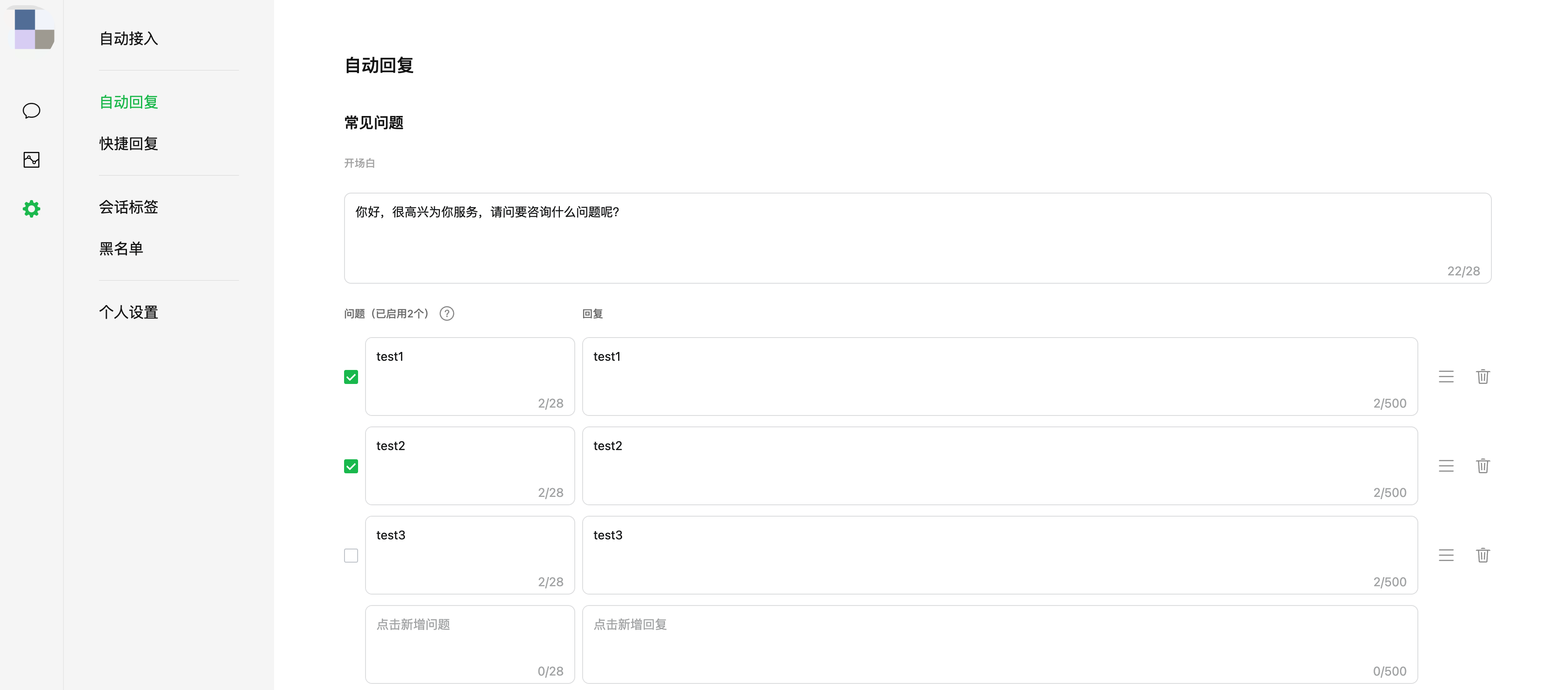 自动回复内可以设置4项自动发送消息的功能,包括「常见问题」、「接入欢迎语」、「离线回复」、「关键词回复」。