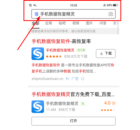如果上述方法不能帮你恢复的话,我们借助于手机工具来恢复。在手机浏览器中查找【手机数据恢复精灵】;找到之后安装在手机上。