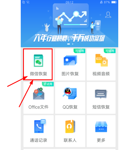 打开首页可以看到这个工具里面有8中手机数据恢复功能,如微信恢复、图片恢复、视频音频恢复、短信恢复等。