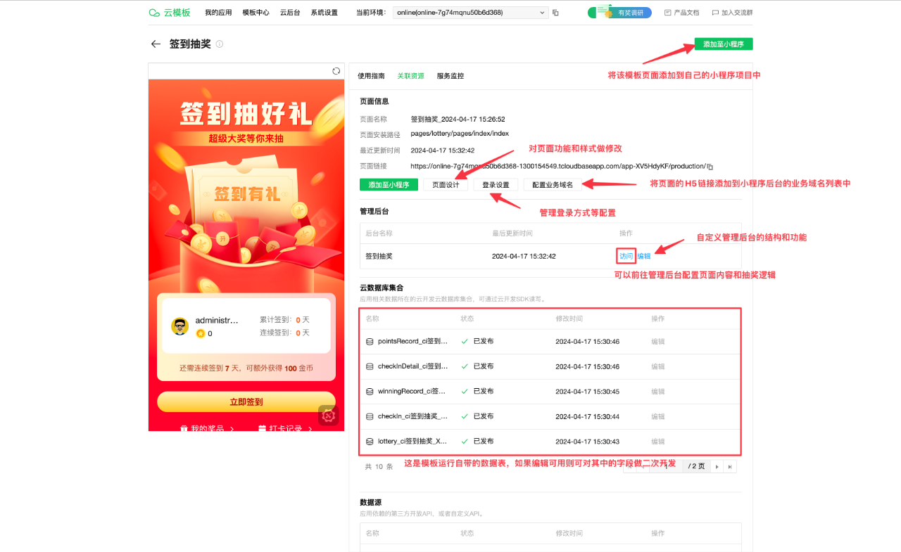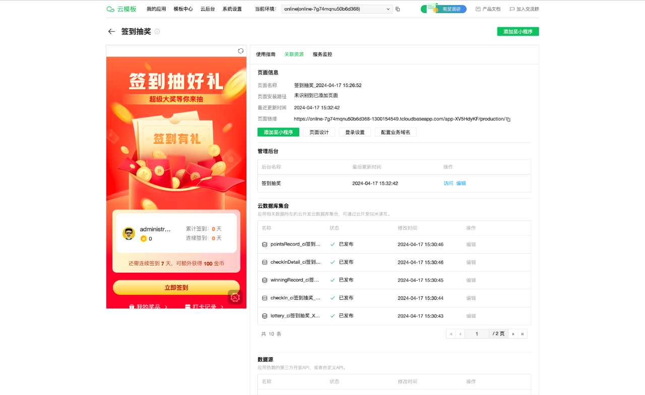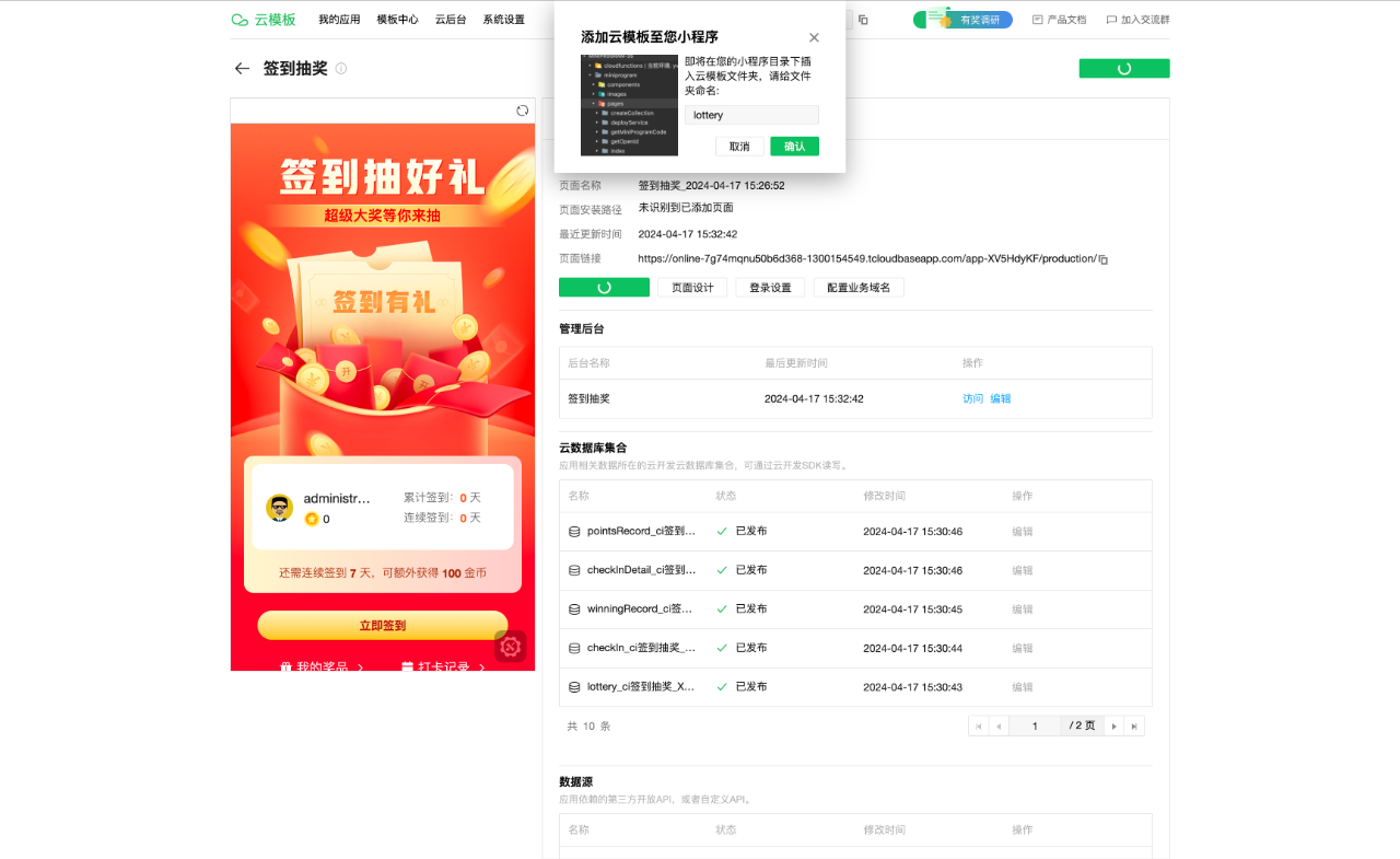 目前「云模板」推出了签到抽奖模块,你可以一键部署并将该模块页面嵌入到自己的小程序中,接下来给大家展示一下云模板使用步骤: