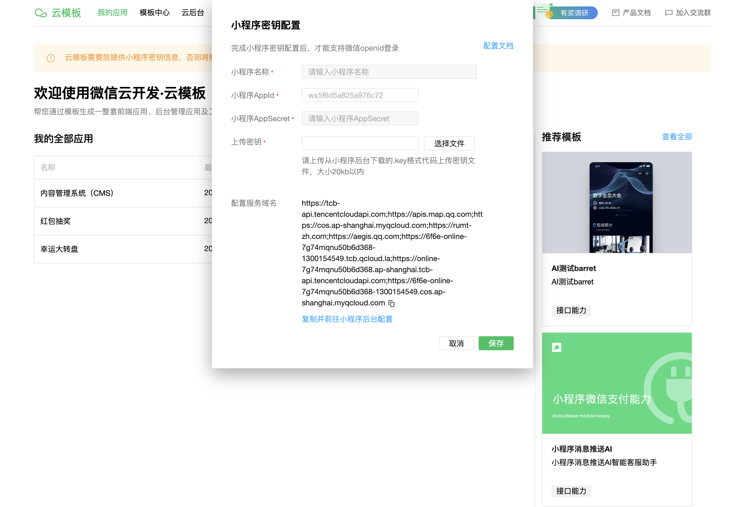 在初次安装云模板时,你需要填写必要的信息到控制台中,点击顶部的黄色警告栏,在弹出的对话框中输入小程序的关键信息。