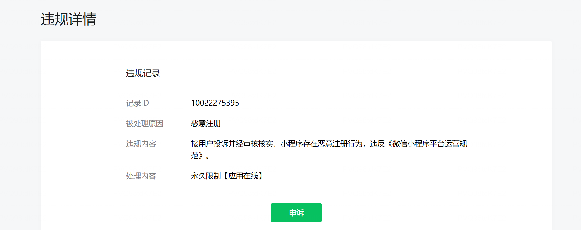 恶意注册,就是这个简单正常的小程序,为什么会报恶意注册,自己产品铺到线上来销售,有没有具体违规的信息提示,申述都一周没有人回复了。违规记录,