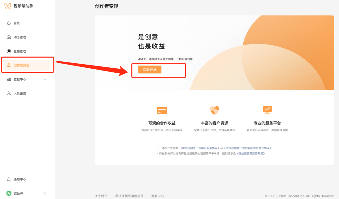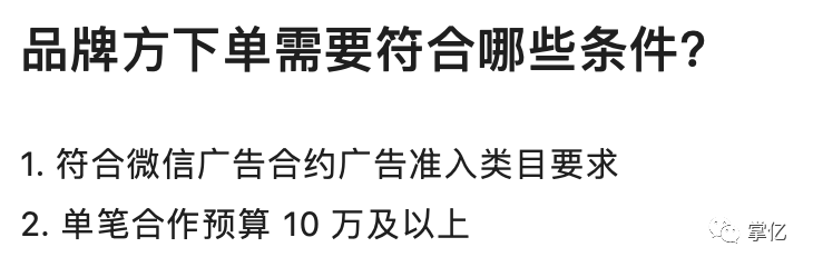 视频号互选平台是品牌方和创作者双向互选、自由达成内容合作的交易平台。在视频号互选平台上,品牌方可根据品牌调性、目标人群等维度与匹配的视频号创作者合作;视频号创作者接受合作邀约后,将结合品牌需求及粉丝偏好为品牌方定制创意内容,最终发布在视频号内。满足1万粉可申请开通广告互选,单笔合作预算10W+