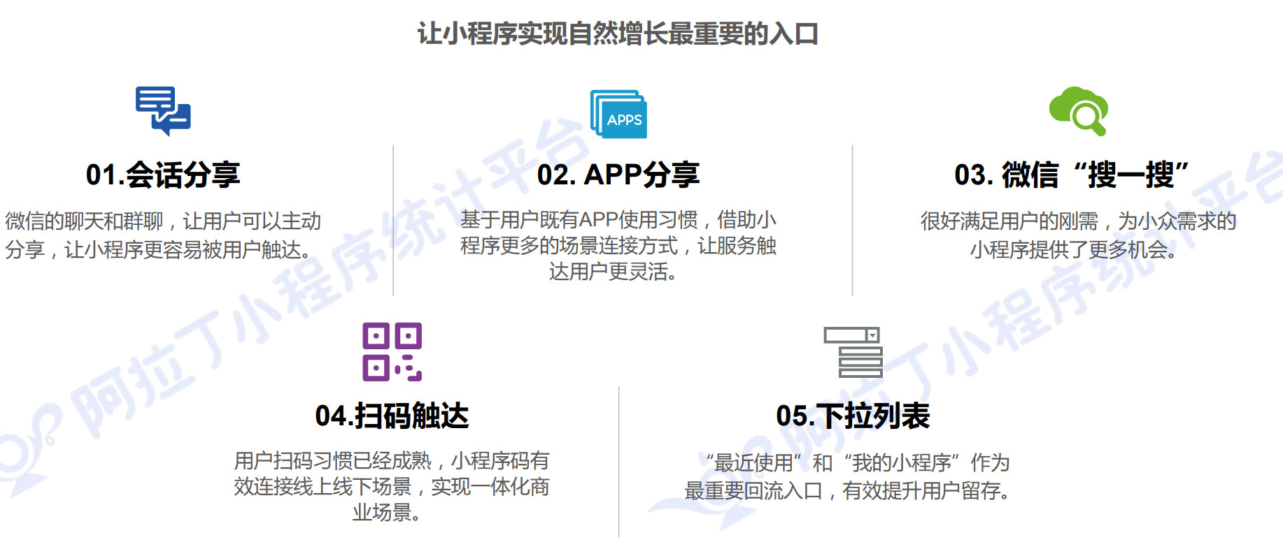 如:小程序特有的快捷下拉、发现页、小程序搜索、服务通知、小程序群标签、文章内嵌等。