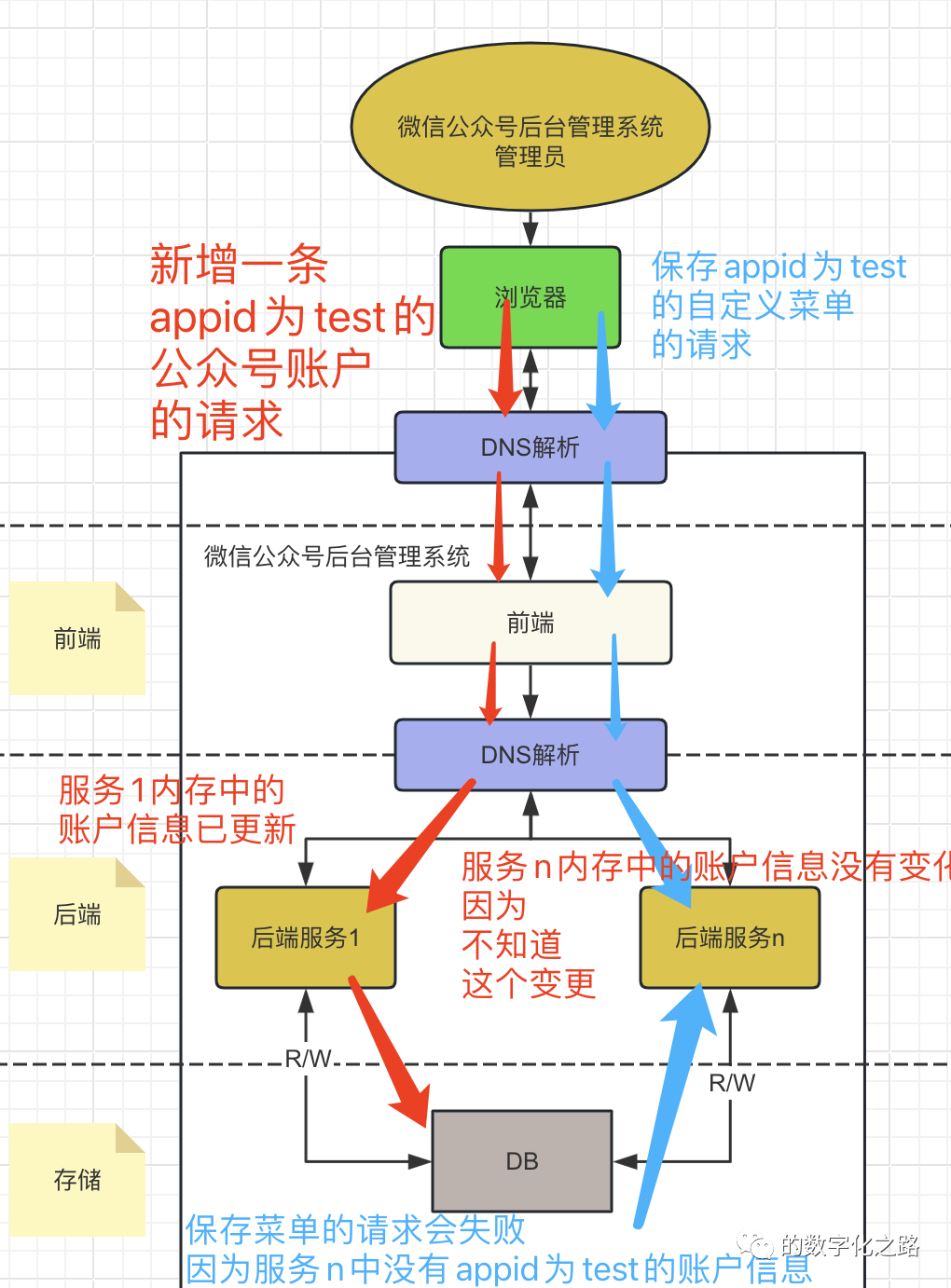 如果一个服务有多个实例,如果公众号账户信息的变更没有同步到其它所有的后端服务,这就出现了数据不一致。