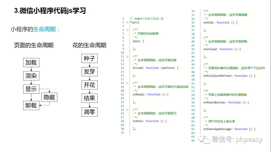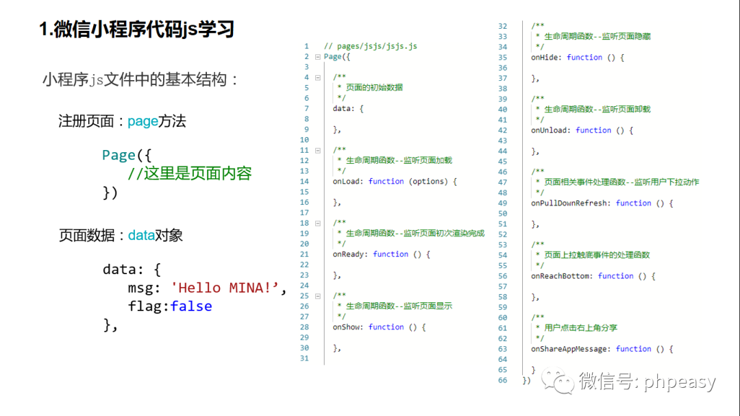同学们大家好,我是小伊同学,前面我们分别介绍了WXML和WXSS,那么今天我们一起来学习微信小程序前端三种语言的最后一种——Javascript,实际上我们在云开发中,前后端都需要使用JS,因此在第三章我们已经讲解了基本语法等知识,下面我们主要来介绍小程序前端开发中的JS相关知识,今天我们首先来一起学习js文件基本结构与生命周期。