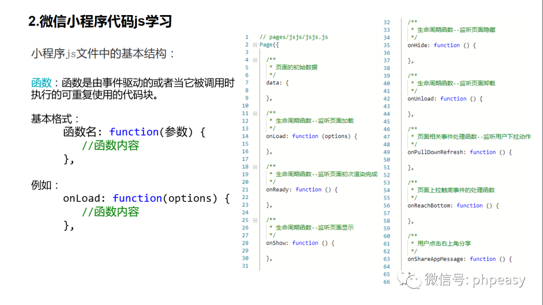对于小程序中的每个页面,都需要在页面对应的 js文件中调用page 方法注册页面实例,指定页面的初始数据、生命周期回调、事件处理函数等。这里的page方法,就是左侧上方的语句,花括号中间为页面内容。也就是说,小程序每个页面的js中都必须写上这个语句,这样才可以创建这个页面,至于页面的内容,则可以按照需要来写,不写任何东西也不会报错。
