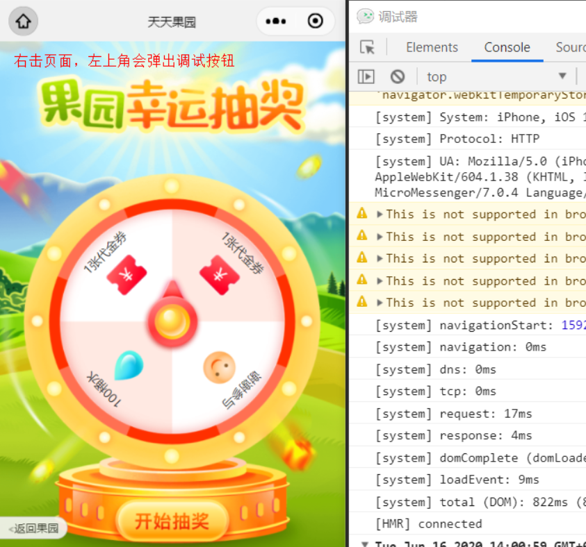 右键点击页面,左上角会出现调试,可以在右图的调试器中对h5进行调试。