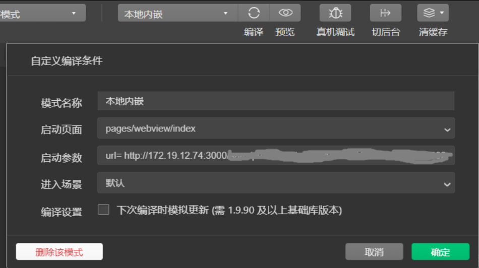 首先通过微信开发者工具打开,这里url本地调试可以跟局域网链接,开发者工具可以实时显示,如果跟的是线上链接,可能只能通过预览扫码。