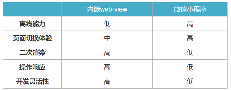 通过查找相关资料发现,内嵌web-view和微信小程序在离线能力、页面切换体验、二次渲染,操作响应和开发灵活性上有如下对比,在不同场景下可能性能上有些许出入,仅供参考。