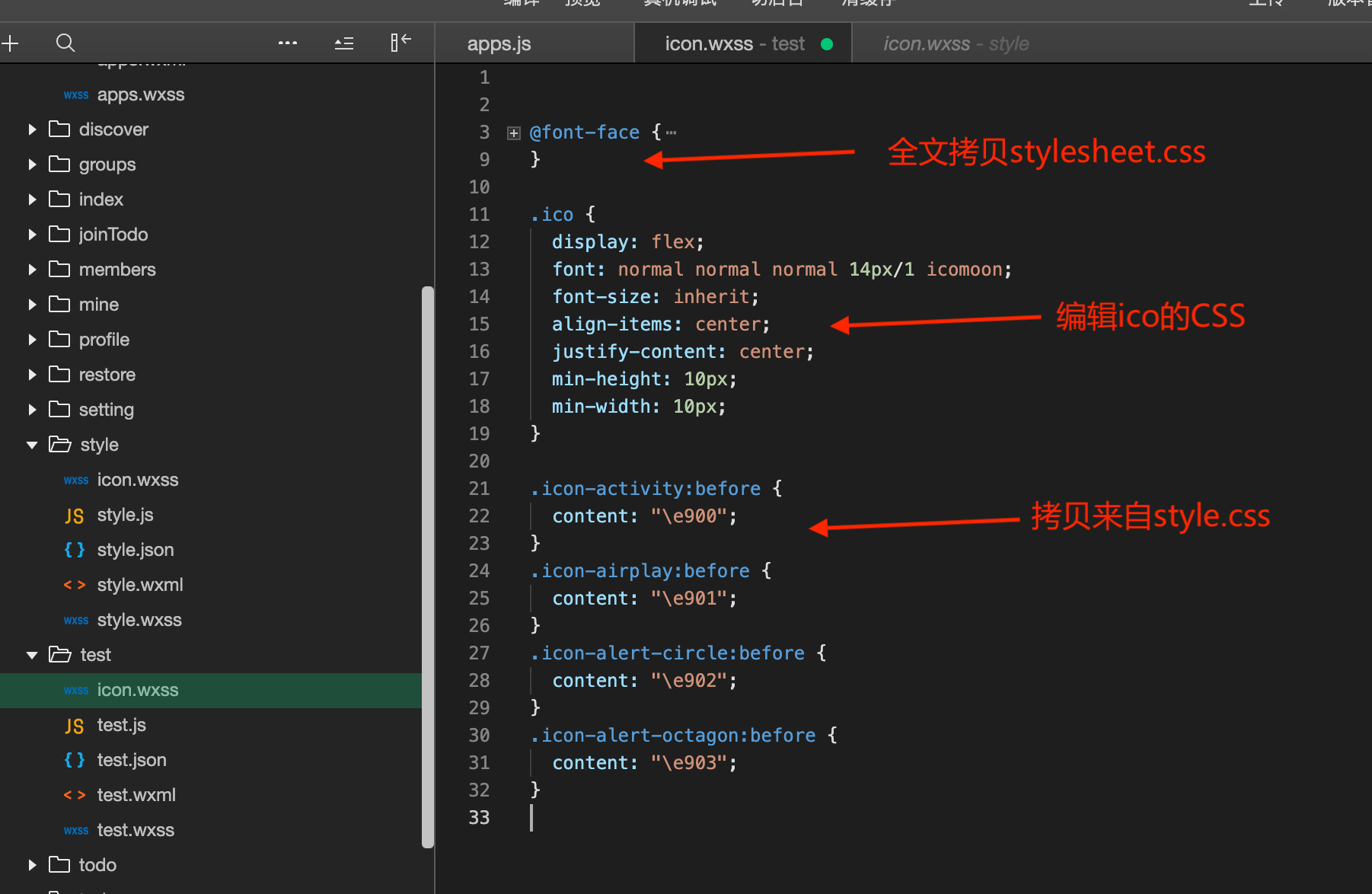 5、将在icomoon生成的文件style.css和在transfonter生成的文件stylesheet.css中的内容编辑合并,生成小程序中的一个wxss文件: