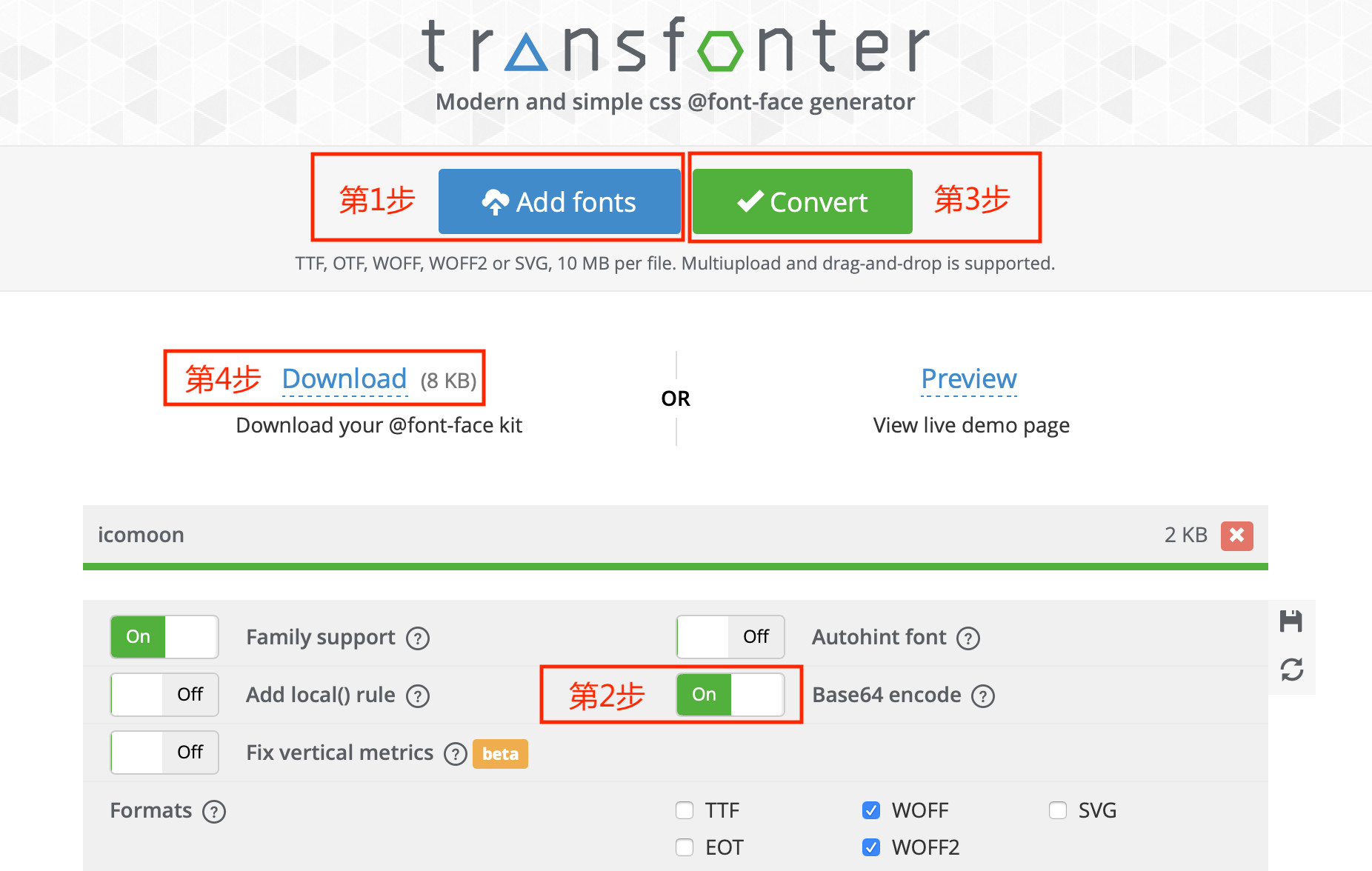 4、生成 @font-face去这里:https://transfonter.org